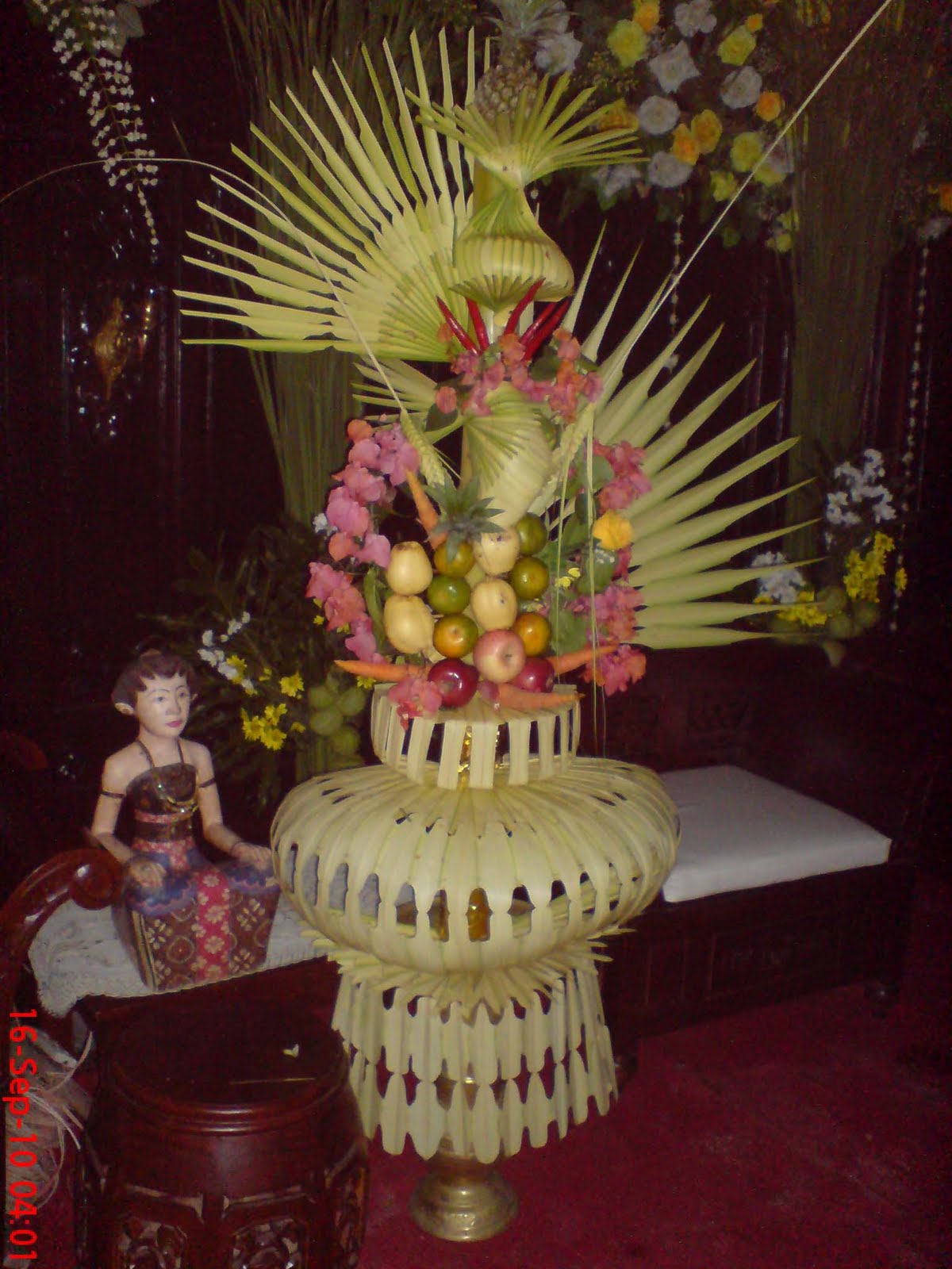 The terminology of Kembar Mayang is. known in a form of janur (young coconut leaf) which is decorated with flowers and leaves in such manner on a banana bar. Kembar Mayang as a typical Javanese flowers arrangement can be seen on an engraving relief which is located on Prambanan temple and named as Kalpataru. The eldest form of Kembar Mayang can. Kembar mayang(Hanacaraka: ꦏꦼꦩ꧀ꦧꦂꦩꦪꦁ) adalah sepasang hiasandekoratifsimbolik setinggi setengah sampai satu badan manusia yang dilibatkan dalam upacara perkawinan adat Jawa, khususnya sejak sub-upacara midodarenisampai panggih. Kembar mayang biasanya dibawa oleh pria dan mendampingi sepasang cengkir gadingyang dibawa oleh sepasang gadis.
